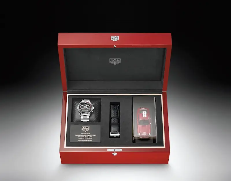El Carrera Chronosprint x Porsche Rallye se presenta en una caja de madera lacada en rojo rubí, color del Porsche 911 número 147, que obtuviera la victoria en Montecarlo. Un homenaje a la historia que encierra. Y como broche de oro, cada reloj viene acompañado de una miniatura del legendario auto, un detalle que hará brillar los ojos de cualquier coleccionista.
